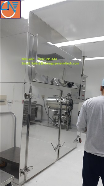 - Bên trong tủ sấy, xe đẩy và khay sấy sử dụng hoàn toàn bằng vật liệu Inox, đảm bảo không tương tác với nguyên liệu và đáp ứng tiêu chuẩn GMP.